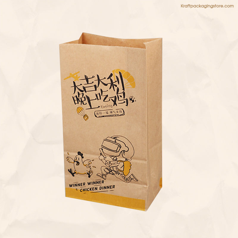 This kind of Kraft bags are used as grocery bags to packing groceries in a grocery store, you can also see them in bakery shops for packing baking food such as bread, toast, etc as bakery bags. Some restaurants also use them as take-out bags. Obviously, they are universe used kraft bags around in our daily life in various sizes. Mostly you see them are in plain brown and white Kraft bags, but they can also be printed to make a tasteful statement to promote your business.
