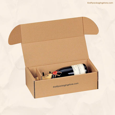 Custom printed Kraft board mailer box with paperboard inserts for wine bottle, cosmetic beauty products.